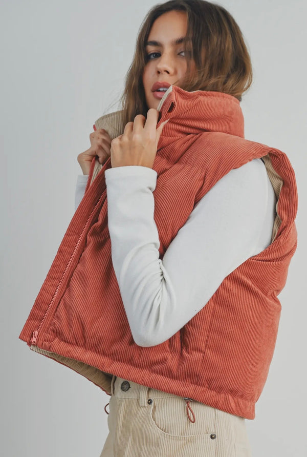 This puffer vest is designed to keep you warm and on trend. Made from high quality corduroy fabric, if offers a unique texture and cozy feel.